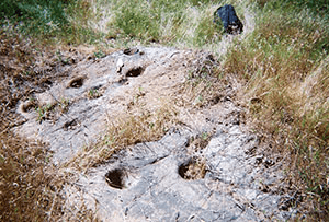 BRMs are grinding depressions that are typically wider than a human fist, with some going as deep as elbow depth and others as shallow as a small dish. BRMs remain visible on sites long after artifacts have been washed away. Accordingly, many living tribes in California consider BRMs to be a sacred object that signifies their direct ancestors’ use of an area. In fact, there is an entire state park in Amador County, California, the Indian Grinding Rock State Historical Park, which contains over 1,000 BRMs. The park includes a museum which features a vast collection of Sierra Nevada Indian artifacts. In addition, the museum features a Miwok village containing a ceremonial roundhouse that has been reconstructed in the middle of the small valley.The roundhouse is registered as a California Historical Landmark; its design reflects the architecture of a traditional roundhouse.
